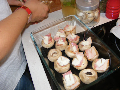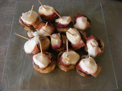 3. Com o "chapéu" do cogumelo virado para baixo pôr 1 ou 2 tiras de bacon com um rectângulo de queijo por cima e usar um palito para prender tudo (que não só é útil para segurar os ingredientes como depois para os convidados se servirem).